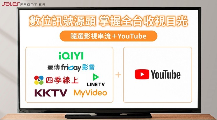 CTV廣告需求強烈,但目前平台分散且廣告流量稀缺,品牌如想跨平台投放必須一一洽談,不但耗時費力且預算容易重複浪費。為了解決痛點,SalesFrontier成果行銷作為全球最大DSP程序化廣告平台 (Demand-Side Platform) - Google DV360的台灣地區官方代理商,又整合各家OTT Premium 流量資源,是目前唯一能跨平台整合YouTube及愛奇藝、friday影音、Line TV、四季線上、My Video、KK TV等可投放主流OTT平台的廣告流量代理商,可提供企業精準的廣告解決服務與方案。