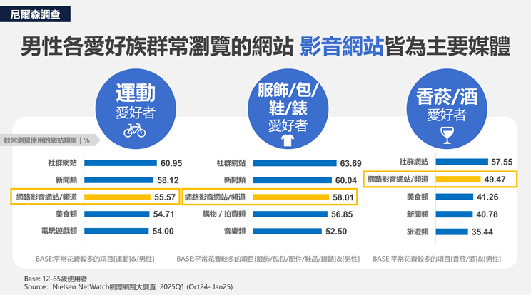 根據Nielsen NetWatch網際網路大調查2025Q1顯示,影音網站已成為男性六大興趣族群:遊戲、汽機車、手機/3C、運動、服飾配件與菸酒愛好者的主要媒體管道,其中「汽機車族群」、「手機/3C族群」、「服飾配件族群」都有近6成的比例經常瀏覽影音平台,顯示OTT行銷正是觸及男性消費決策的重要方式。搭配父親節檔期,品牌若能巧妙投放廣告在多元熱門影劇上,不僅提升曝光與共鳴,更能進攻男性觀眾消費心態,創造節日行銷最大效益。