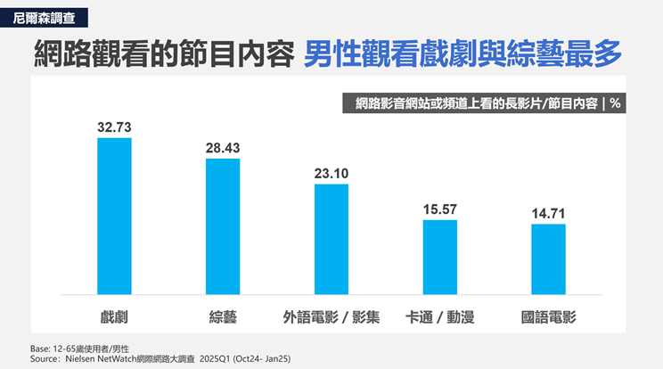 男性追劇的原因可能是單純的娛樂,也可能是為了放鬆心情、消遣時光。 追劇也可能成為他與家人、朋友之間的共同話題,甚至可以透過追劇來了解不同文化和社會現象。從Nielsen最新資料也顯示,男性觀眾在網路影音平台上觀看最多的長節目類型為戲劇與綜藝,分別佔比32.73%與28.43%,顯示他們對情節推進與娛樂放鬆類型內容有高度偏好。相較於其他節目型態,這類節目更容易形成收視偏好與情感連結。以iQIYI愛奇藝和遠傳friDay影音為分析,男性觀眾都會