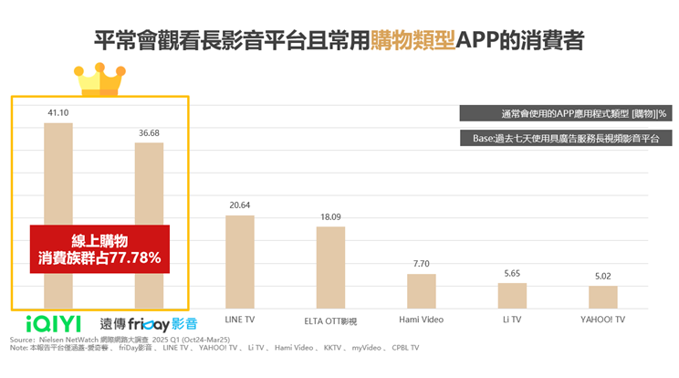 影音平台消費者可是追得痛快也買得起勁,藉由追劇風潮帶動起消費熱潮,根據Nielsen NetWatch網路影音大調查,平常會觀看長影音平台且在日常生活中也高度依賴購物類型APP的消費者,觀看iQIYI愛奇藝與遠傳friDay影音的比例最高。