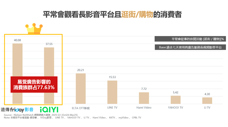 另一方面,若觀察平常所從事的休閒活動「逛街/購物」的習慣,遠傳friDay影音觀眾有40.08%、iQIYI愛奇藝觀眾則有37.55%,同樣領先其他競爭者,兩者合計77.63%,這族群會是「易受廣告影響」的觀眾,在廣告投放與品牌行銷上具有高度價值。