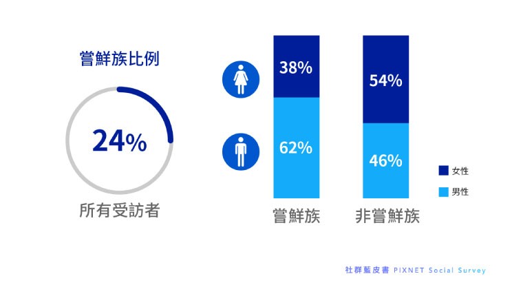 在消費傾向部分,從調查中也概略看出「嘗鮮族」的輪廓,24%的網友有嘗鮮族特性,如:新品搶先使用、主動蒐集新品資訊等,其中高達62%是男性,有18%的嘗鮮族是高度社群活躍者,家庭平均所得高於非嘗鮮族。