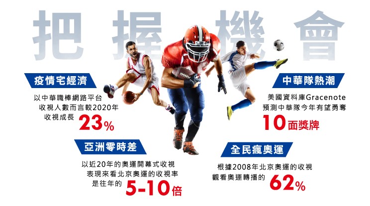 根據數據顯示,以中華職棒網路平台收視人數而言,雖賽事減少,但2020年觀看人數較2019年明顯成長了23%;再以近20年的奧運收視表現來說,無時差的北京奧運在台收視率更是其他幾屆的5-10倍。美國資料庫Gracenote在今年更是預測,身為台灣之光的「中華隊」有望勇奪10面獎牌。